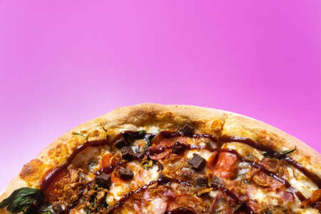 Delicious large pizza with bacon and spinach on a pink background.