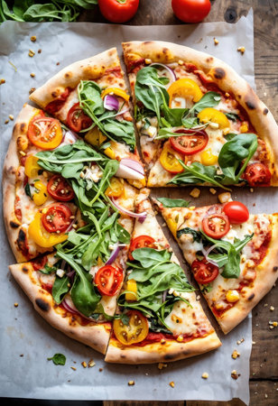 A gourmet vegetable pizza with cherry tomatoes and arugula on a wooden table