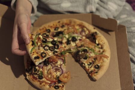 Pizza party. Hand picking slice of pizza.