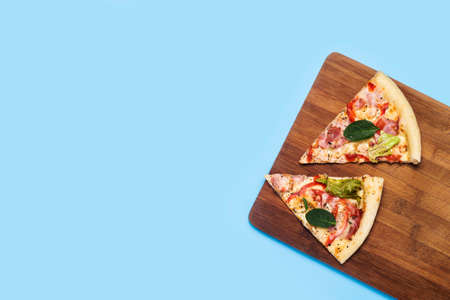 two slice of hot fresh pizza lies on a wooden board on a blue background. Top view, flat lay.