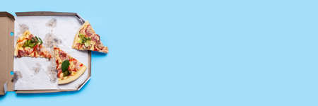 slices of hot fresh pizza in cardboard packaging on a blue background. Top view, flat lay. Banner.