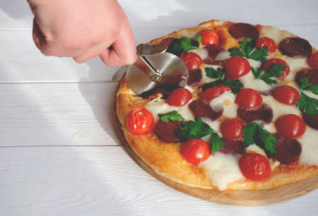 human hand with pizza cutter cut pizza in the kitchen. homemade italian pizza. traditional pepperoni with tomatoes, mozzarella and salami.