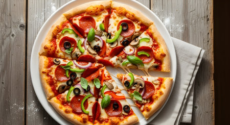 A pizza with pepperoni, mushrooms and green peppers on a plate, AI