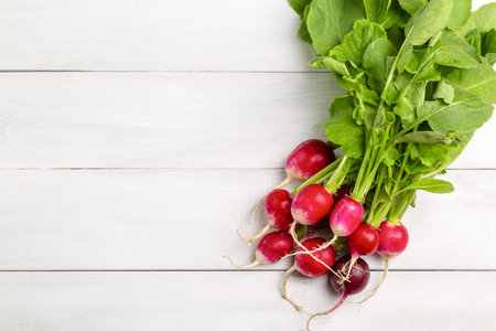 Fresh bunch of radishes on a white wooden background.
