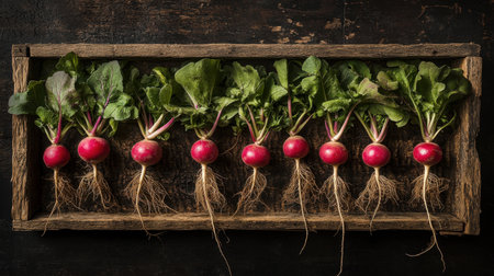 This image features a row of freshly harvested radishes with vibrant green leaves arranged on a rustic wooden background, showcasing the beauty of natural produce.
