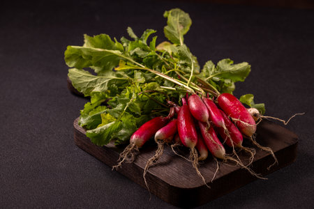 Fresh red radish on a dark table. Growing organic vegetables. A bunch of raw fresh radishes on a dark background ready to eat. Raw food. food photography - Image