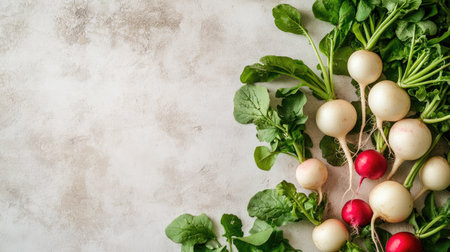A vibrant display of fresh radishes and greens on a rustic textured background, perfect for healthy cooking and organic food promotion.