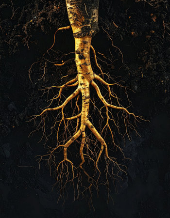 Deep beneath the surface, a powerful network of golden roots anchors a tree, drawing life and strength from the rich, dark earth.