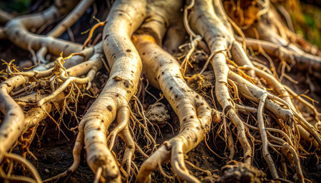 Earthy showing macro shot of thick, textured plant roots embedded in dark soil keywords: roots, plant, soil, earth, close-up, thick, textured, organic, growth, nature, underground, brown, white, detail, natural, agriculture, botany, life, system, structure, macro, garden, farm, digging, harvest, natural history, biology, root system, plant life, earthy, natural elements, natural beauty, intricate, detailed, dark soil, woody description: an extreme close-up shot focuses on the complex network...