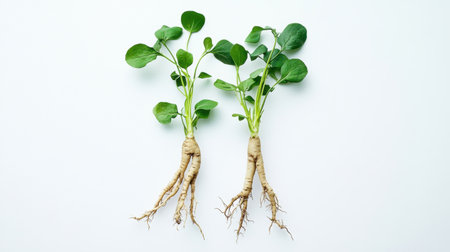 Studio shot of a vibrant, young plant with its roots displayed against a white backdrop. Shows leaves and roots. Perfect for illustrating botany, growth or organic gardening.