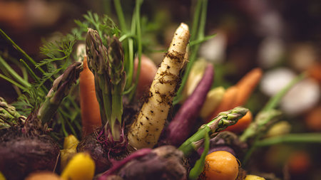 Close-up of freshly harvested root vegetables, including carrots, asparagus, and beets, showcasing natural colors and textures.
