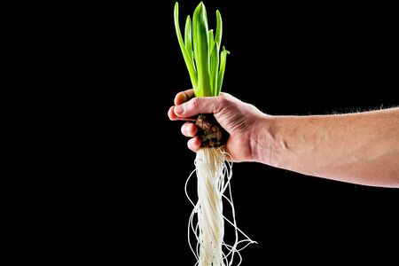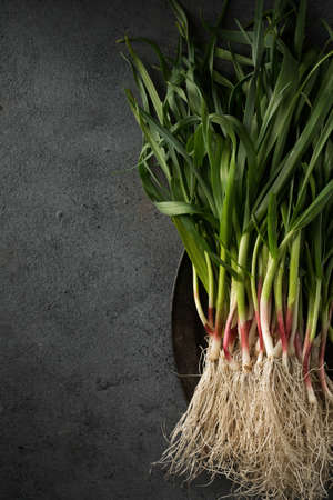 healthy plant-based ingredients, bunch of spring onions with roots on kitchen countertop