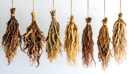 Flat lay of dried ginseng roots arranged artistically on a white background. The rugged natural forms stand out against the clean and bright backdrop.