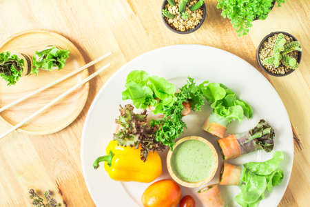 Colorful fresh vegetables salad spring roll eating with chili sauce, Healthy vegan food