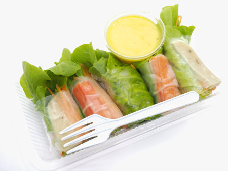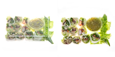 Salad roll vegetables wrapped in flour with salad dressing on clear plastic box