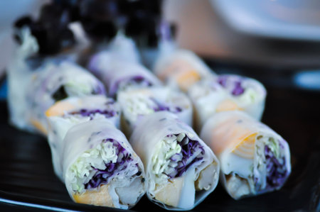 Fusion food many kind of vegetable spring rolls for healthy eating.