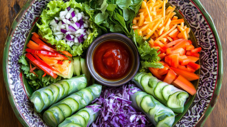 Vibrant, wholesome Asian cuisine displayed on a rustic wooden platter, featuring crisp spring rolls, fresh vegetable salads, and colorful dipping sauces creating a lively, app