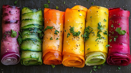 Colorful spring rolls with cucumber, red, yellow, green and purple on black background