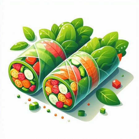 Vector illustration of fresh spring rolls with vegetables, herbs and spices.