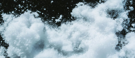 Fresh snow texture with delicate flakes on a black background for design purposes