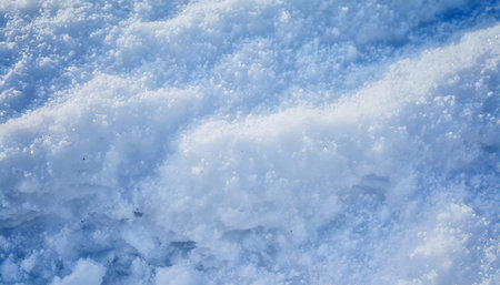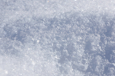 Sparkling white snow crystals covering ground wintertime close up. Texture of smooth surface covered soft snow at sunlight. Beautiful snowflakes shining on winter cold sunshine. Natural pattern.