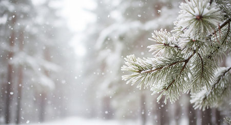 Photography captures snow-laden pine branches with frost, contrasted by a rich green background, evoking a tranquil winter atmosphere with copy space for text