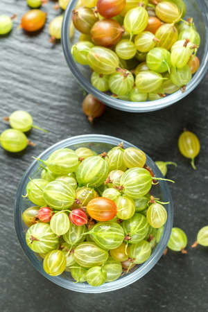 Gooseberries in a glass plate, and scattered next to a plate on a black background of a slate board, space for text