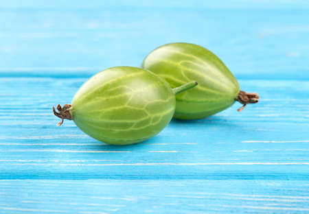Two green gooseberry on a blue wooden background