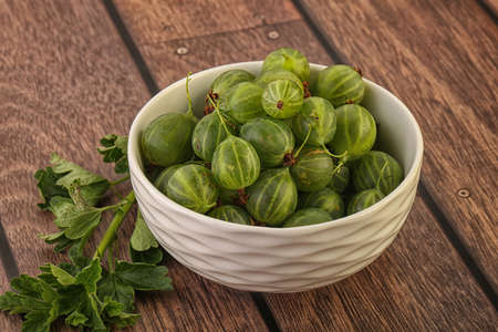 Fresh gooseberry in a wooden bowl. Small depth of field.