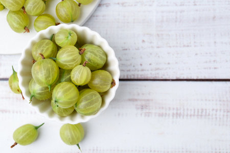green fresh gooseberry berry in a bowl on wooden table. ripe fruit food. top view