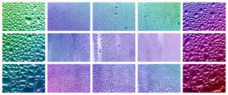 A collage of many different fragments of glass, decorated with rain drops from the condensate. Rainbow colors