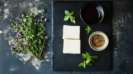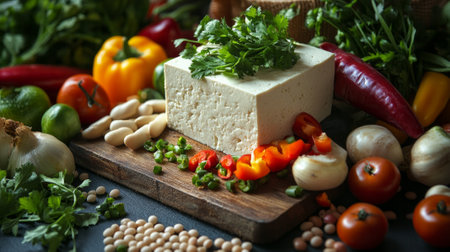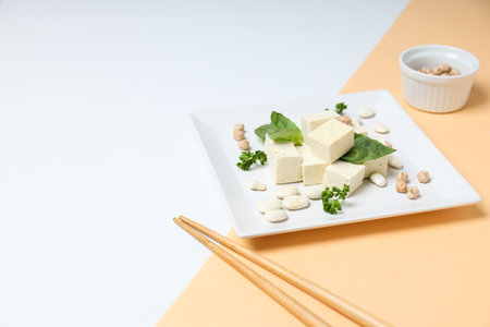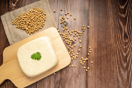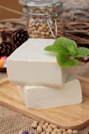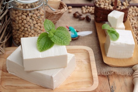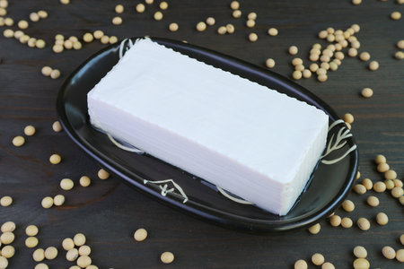 Fresh tofu made from organic soybeans is an ingredient in plant based as a healthy and vegetarian food.