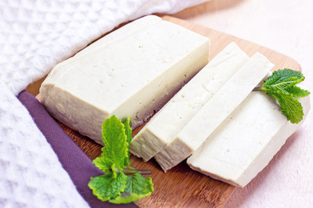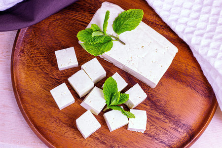 Raw organic vegetarian tofu slices with fresh mint on wooden background.