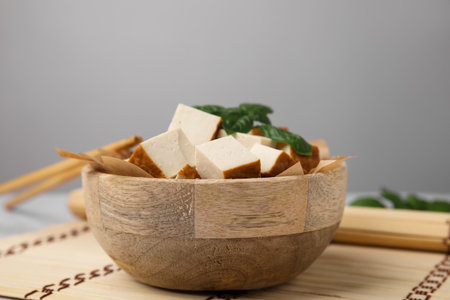 Bowl of smoked tofu cubes and basil on bamboo mat, closeup