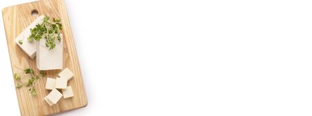 Tofu on wooden plate top view, isolated white background. Panorama