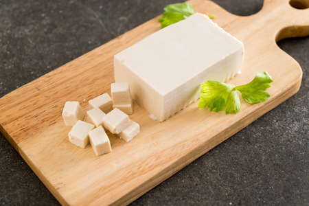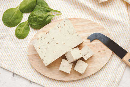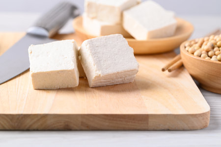 Fresh tofu on cutting wooden board, Vegan food ingredient in Asian cuisine, Plant based diet