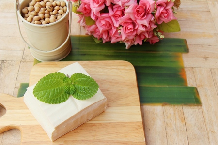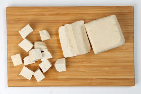 Soyabeans soya bean curd tofu wooden board block slice dice chopped