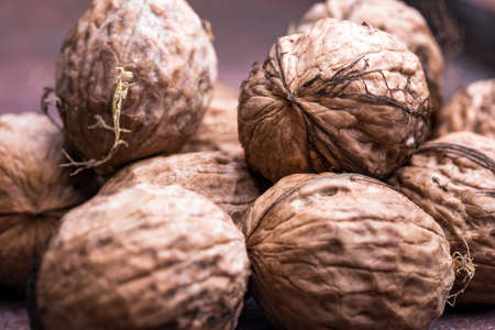 Whole walnuts nuts with shells close-up background studio shot