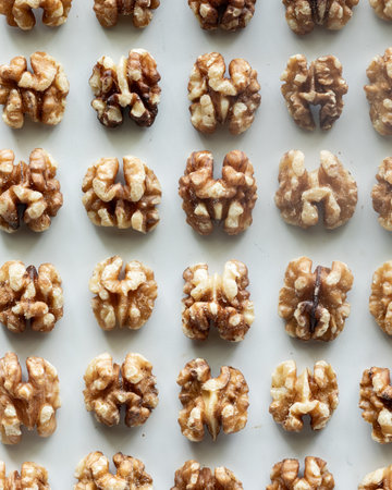 Top down view of rows of fresh undamaged shelled walnuts.