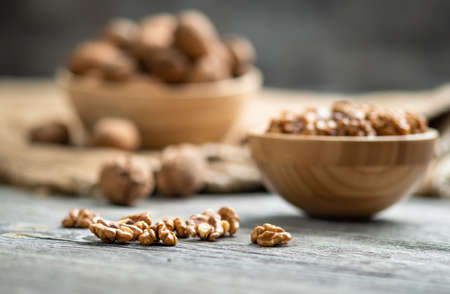 Fresh walnut kernels and whole walnuts in a bowl on rustic old wooden table. Healthy organic food, BIO viands, natural background. Copy space for your advertising text message.