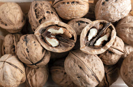 View from above of common walnuts with shells.