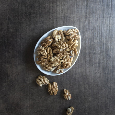 Raw Walnut Halfs in a Bowl, side view. Copy space.