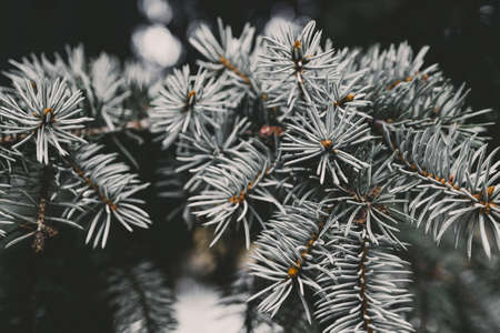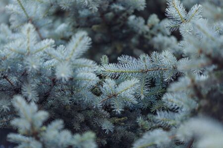 Abstract background close up blurred conifer evergreen fir tree branches natural. Toned nature frame