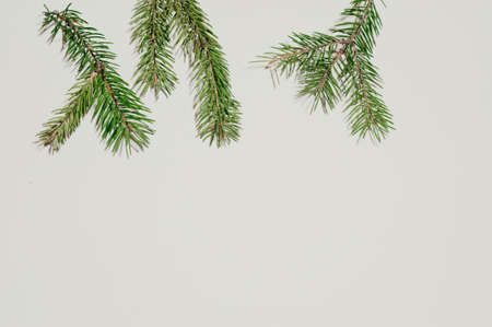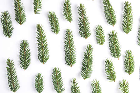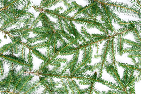 Christmas tree branches on a white background. Flat lay, top view.