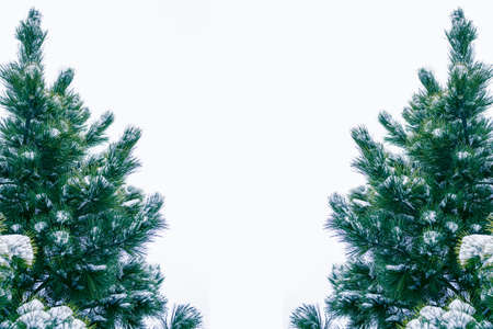 A beautiful arrangement of frosted evergreen branches creates a serene frame around a blank space, ideal for winter designs, holidays, and seasonal greetings.