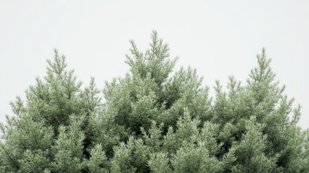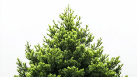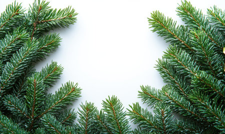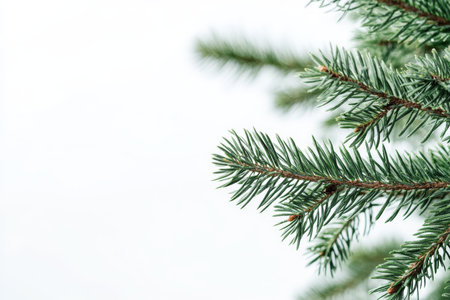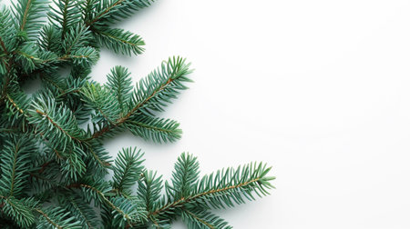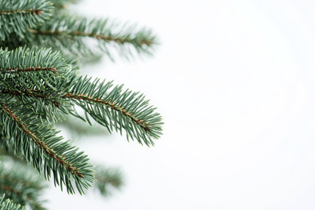 This tranquil closeup image features a conifer Christmas tree branch, highlighting lush green needles against a white background, ideal for holiday designs and capturing the festive seasons essence