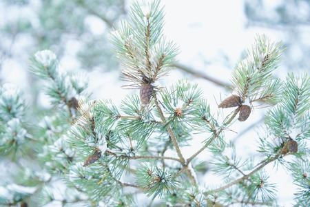 Beautiful green pine branches with cones in winter