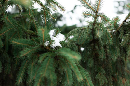 Drop of melting snow on branch of pine tree. Copy space, selective focus