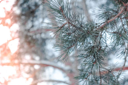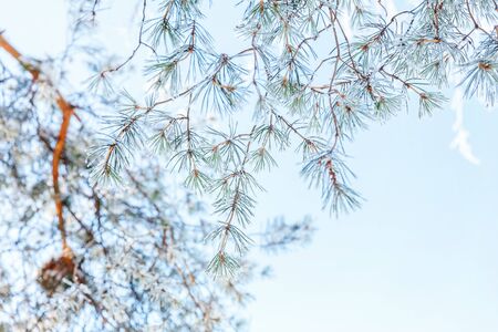 Frosty pine tree branch in snowy forest, cold weather sunny morning. Tranquil winter nature in sunlight. Inspirational natural winter garden or park. Peaceful cool ecology nature landscape background