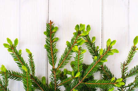 Natural white wooden background with spruce brunches